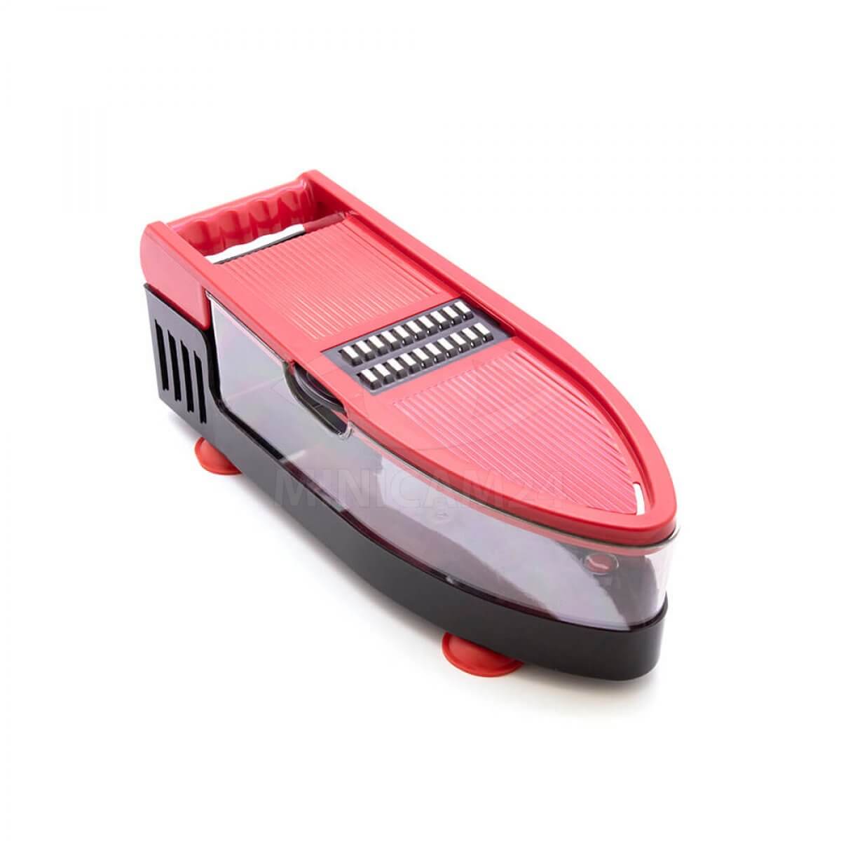 Удобная ручная терка в корпусе из прочного и экологичного ABS-пластика с прозрачной ванной для готового продукта и контейнером для обрезков. Основание терки снабжено присосками для прочного сцепления с поверхностью стола. Терка не скользит по столешнице во время работы. В комплекте шесть сменных ножей различной конфигурации. Ножи заменяются очень быстро и позволяют нарезать овощи различными способами. Пластмассовая рукоятка облегчает работу и предотвращает травмирование пальцев. Отдельно приложен нож для чистки овощей.